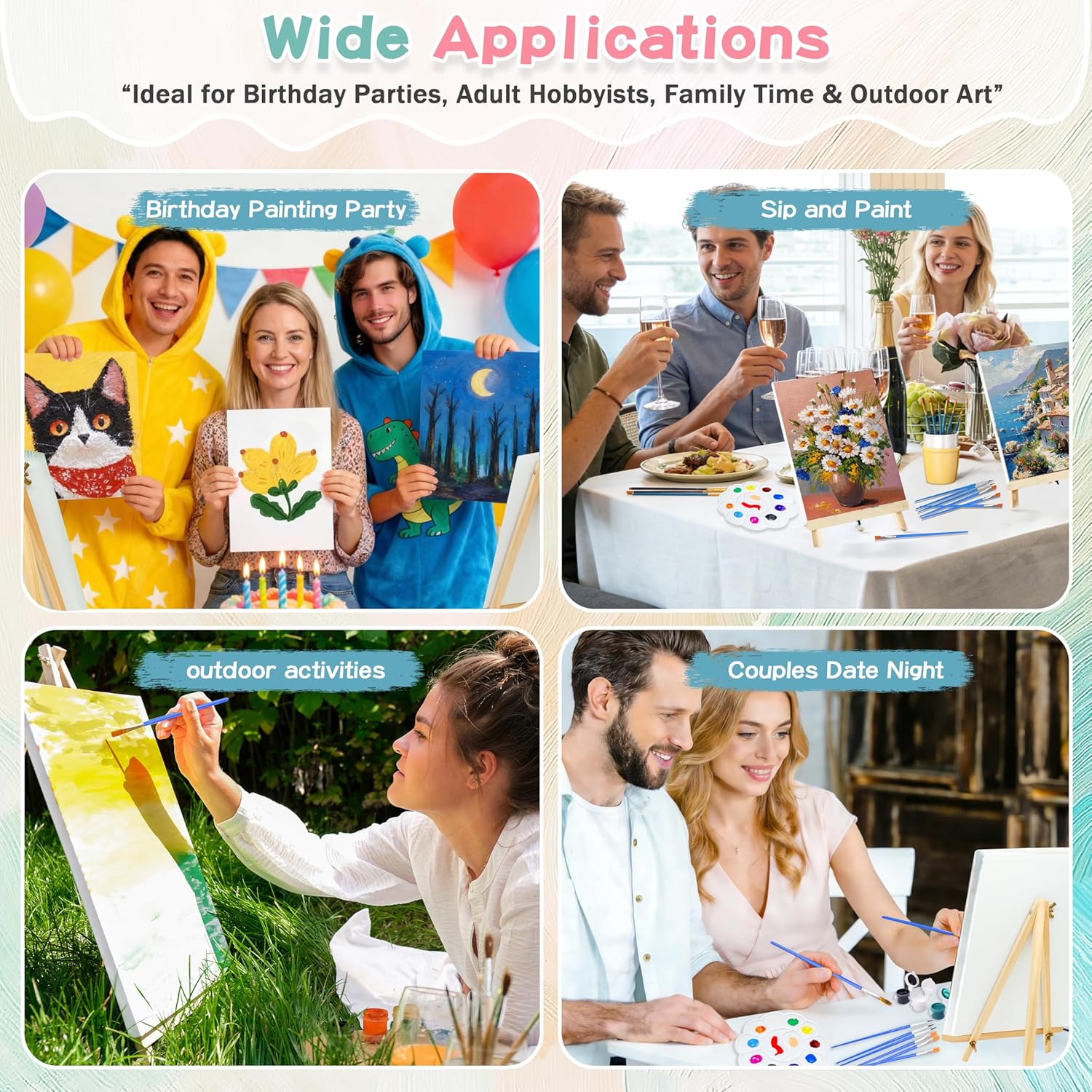 🪵[Adjustable Solid Wood Easels for Painting] Each 11.8″ wooden easel features an adjustable tilt mechanism (19-30cm height) for optimal angles. Made from durable pine, these portable easels are perfect for adult,couples painting kits, classrooms, or home studios—even doubling as phone/tablet stands. This versatile canvas and easel set for party enhances any paint and sip experience with stability and convenience