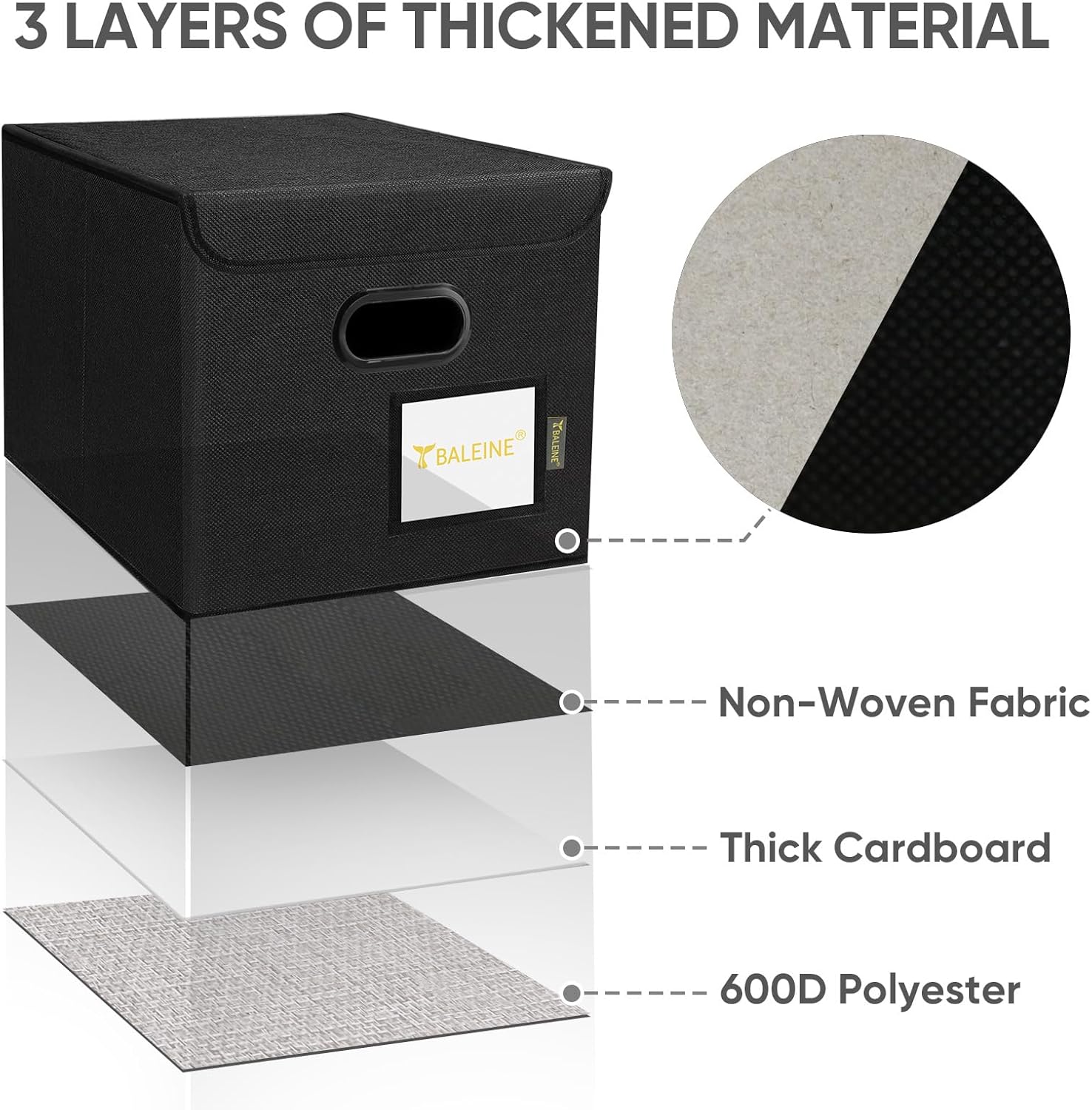 [DURABLE MATERIAL] The outer layer of our filing box is crafted from high-quality polyester fabric and reinforced with thick cardboard in the middle. This construction ensures that the box maintains its shape and provides better bearing capacity for important documents and files. Its textured appearance can also serve as a stylish decorative element in any office or home.