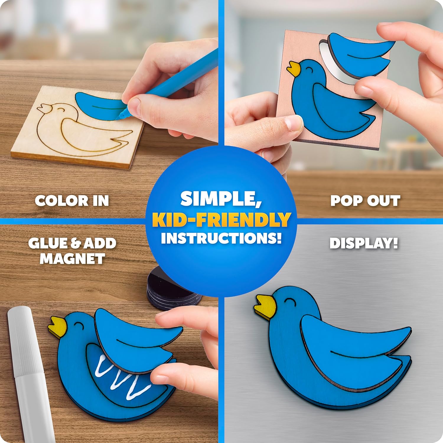 ALL-INCLUSIVE CRAFT KIT – This fun arts and crafts kit includes everything kids need: 15 woodcuts, 15 adhesive-backed magnets, glue, and 8 colorful markers (red, brown, blue, green, orange, pink, purple & yellow), to let their imaginations run wild.