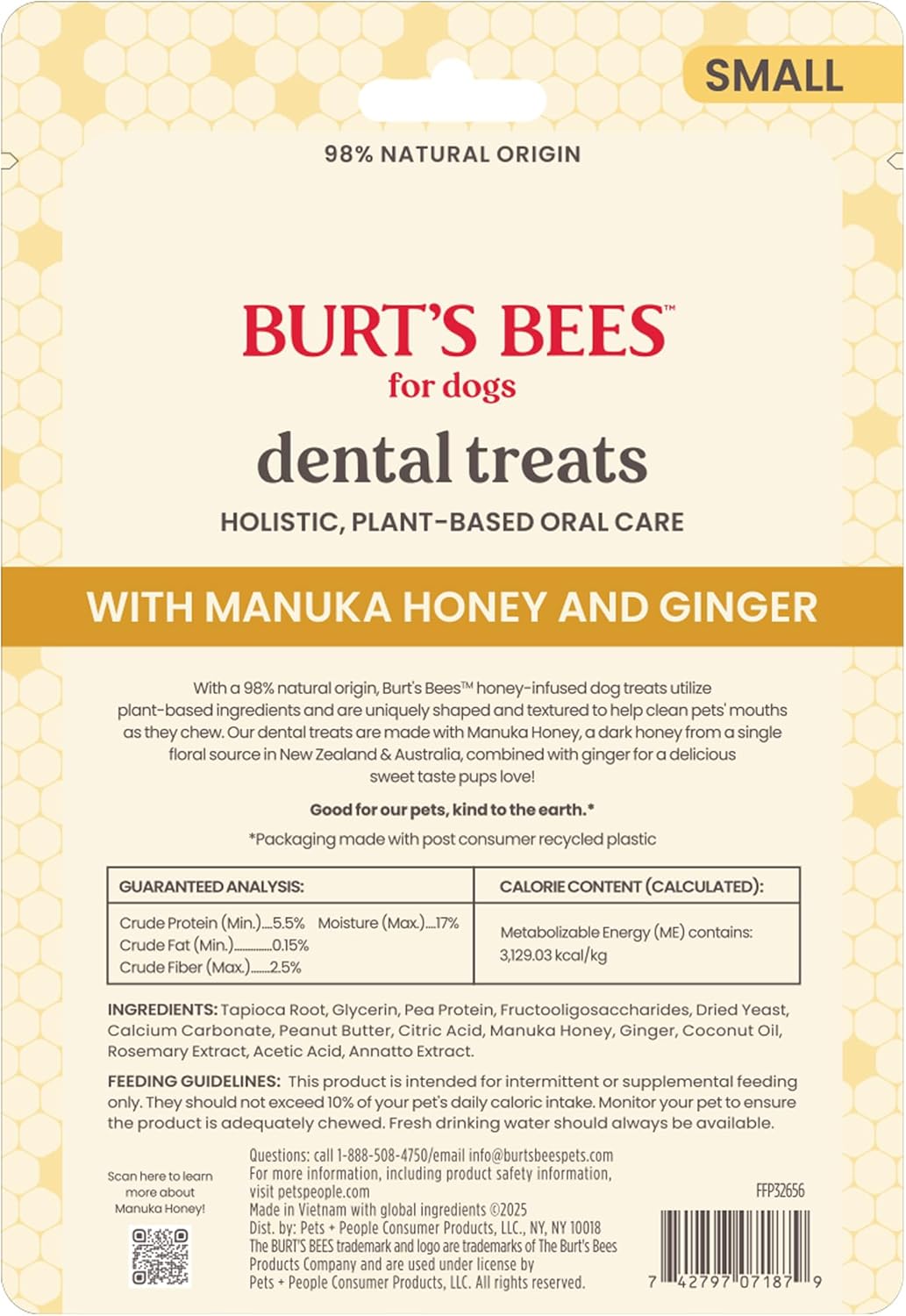 BURT’S BEES FOR PETS Dental Treats for Dogs with Manuka Honey & Ginger, Holistic, Plant-Based Oral Care, 98% Natural Origin Formulas, Peanut Butter Flavor, Dog Treats Small Dogs, Sz Small 10ct, 7 oz