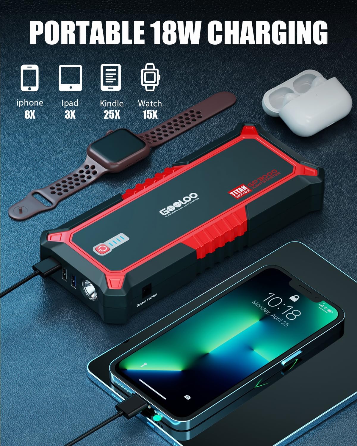 PRO-LEVEL KIT + LIFETIME SUPPORT: Includes: GOOLOO 3000A Car Jump Starter, Heavy-duty clamps (10,000+ clamp tests), USB-C cables, storage bag. Backed by GOOLOO’s 18-month warranty and 24/7 online assistance.