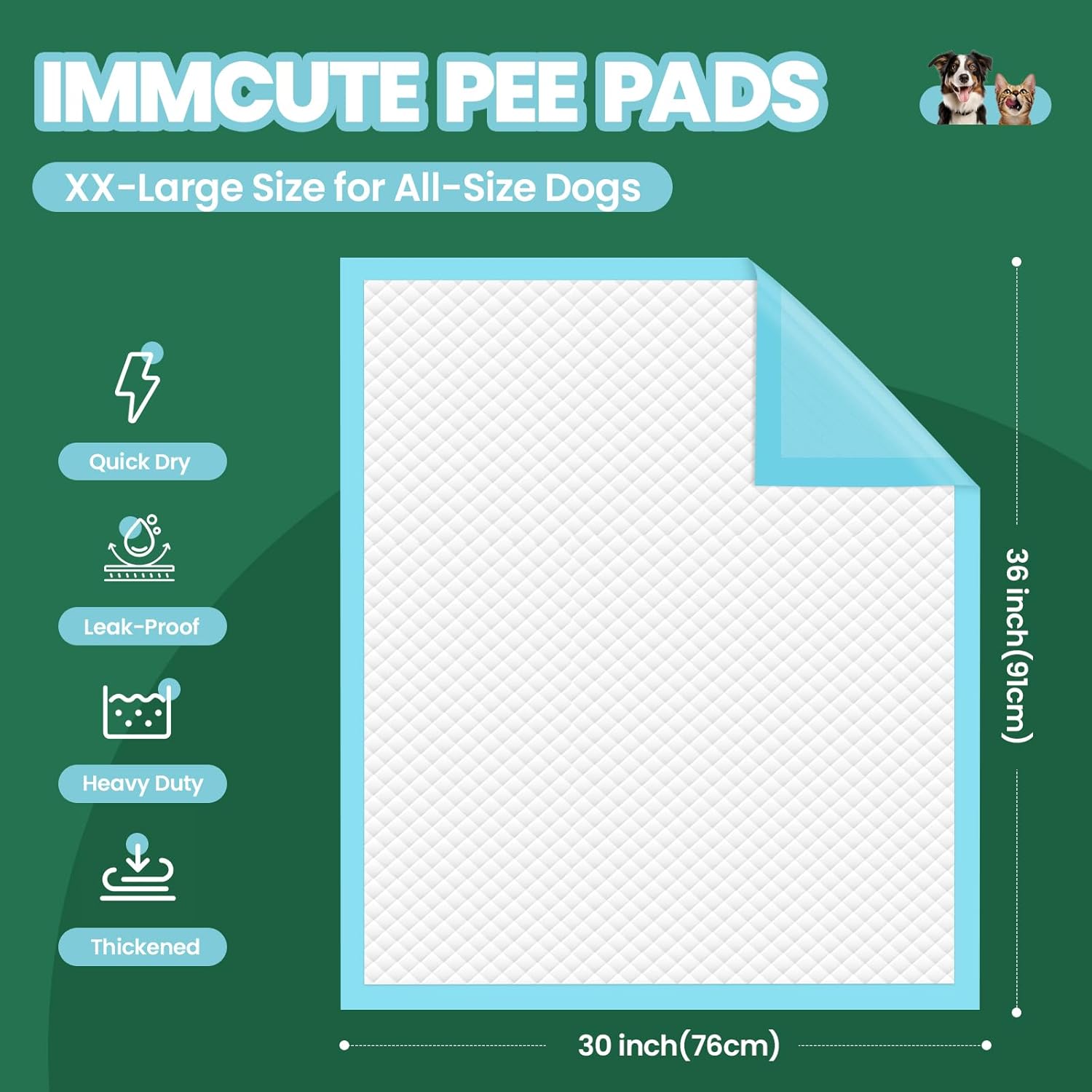 Specification: IMMCUTE 50 Pack Dog Pee Pads, 30″x36″ Great Value Puppy Pads XL, Pee Pads for Dogs Extra Large, Wee Wee Pads for Potty Training, Disposable Doggie Pads Super Absorbent & Leak-Proof