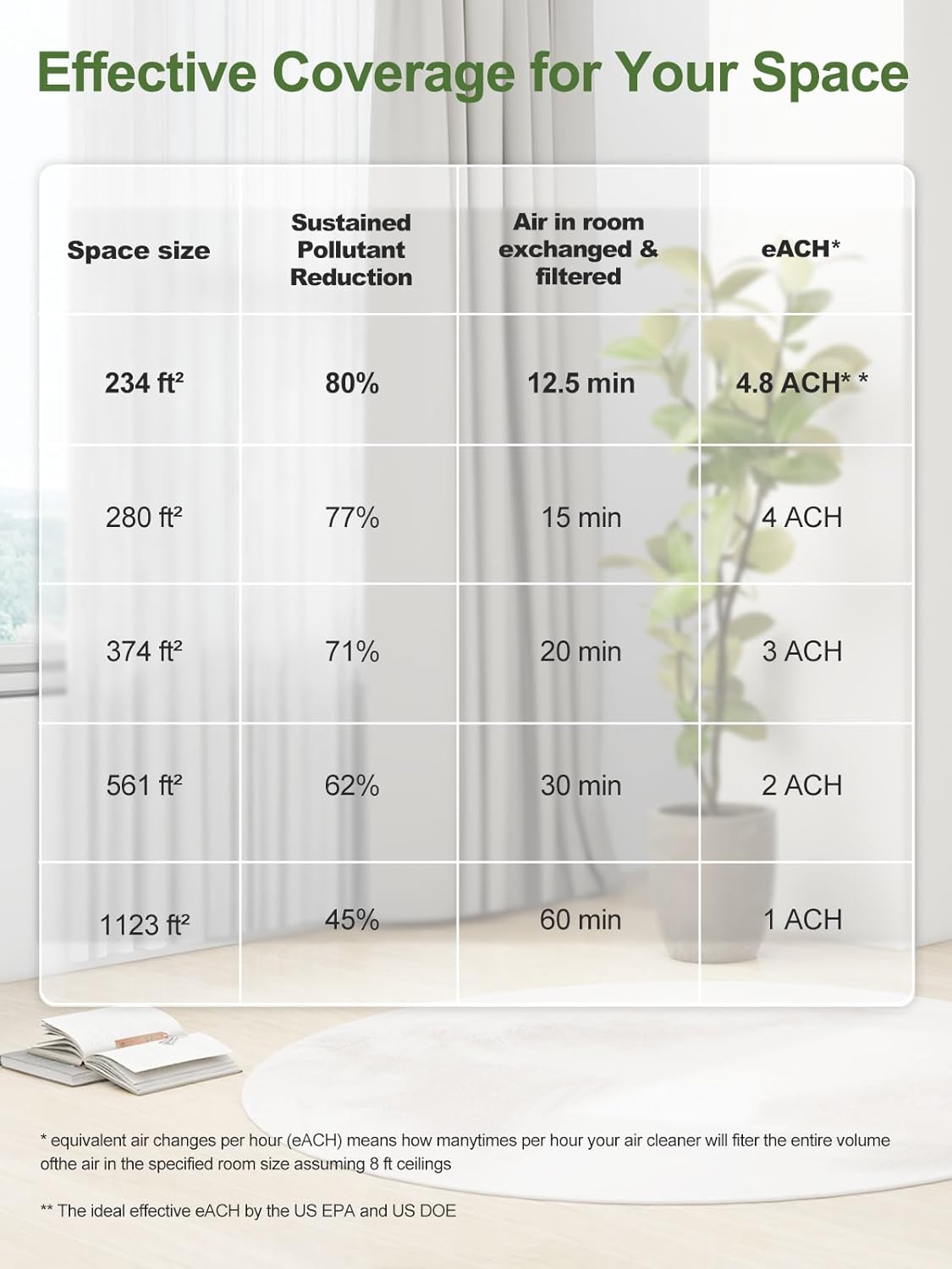 Powerful Purification for Large Rooms: Cleans spaces up to 1123 ft² in 1 hour, refreshing air efficiently for bedrooms, living rooms, and offices.