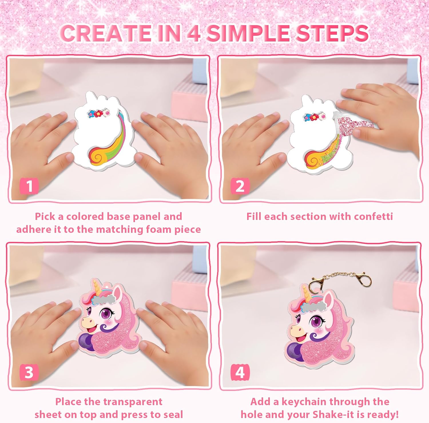 CREATE, SHAKE & SHOW SPARKLING MAGIC: filling animals shapes with vibrant confetti and glittering beads, sealing them up, and giving them a joyful shake to see the colors swirl. Each creation becomes a portable, shimmering masterpiece when attached to the included keychains—perfect for adding a personalized sparkle to backpacks, lunch boxes, bedroom decor, or gifts