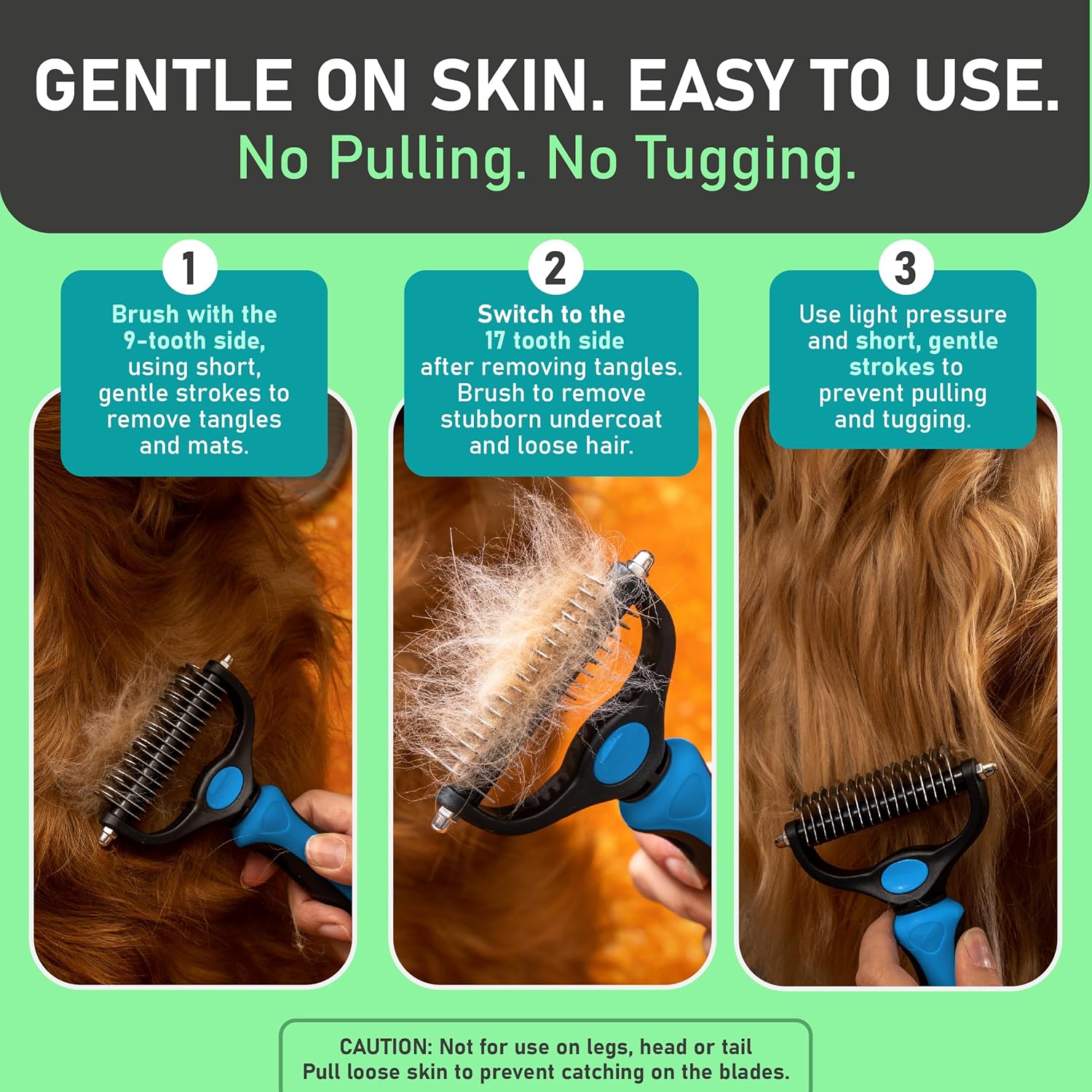 DUAL-SIDED DESIGN: Our Undercoat Rake Dog brush is perfect for deshedding your pet’s coat. Designed with a dual-sided design, start with a 9-teeth side to tackle stubborn mats and tangles, and finish with a 17-teeth side to thin out and deshed after.