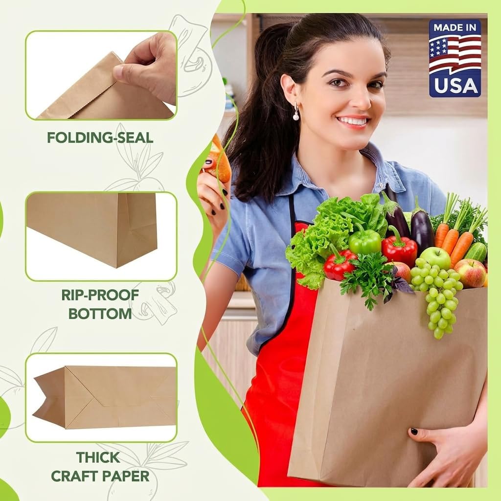 Premium 60# Kraft Paper: Crafted from high-quality, thick 60-pound kraft paper, these bags offer unmatched strength and durability. Perfect for carrying grocery items without tearing, 100 pack