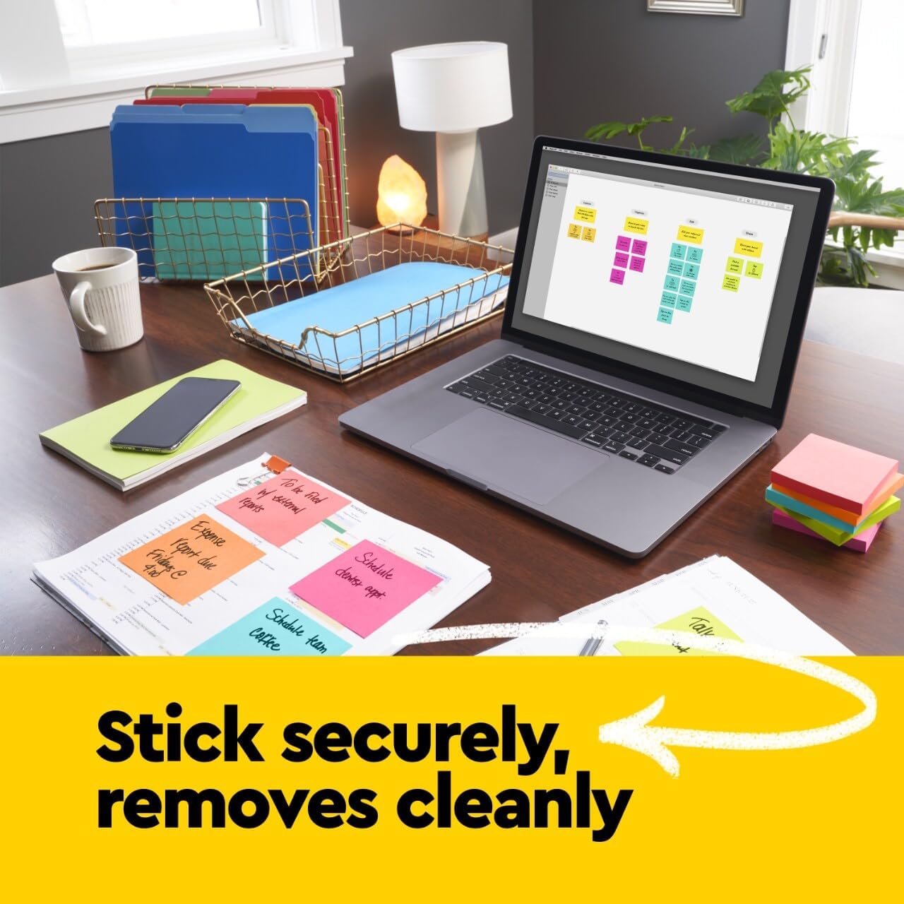 NO SURFACE DAMAGE: Post-it Notes stick securely and remove cleanly; no tape or tacks are needed, and the adhesive backing of these reusable sticky notes allows for easy repositioning