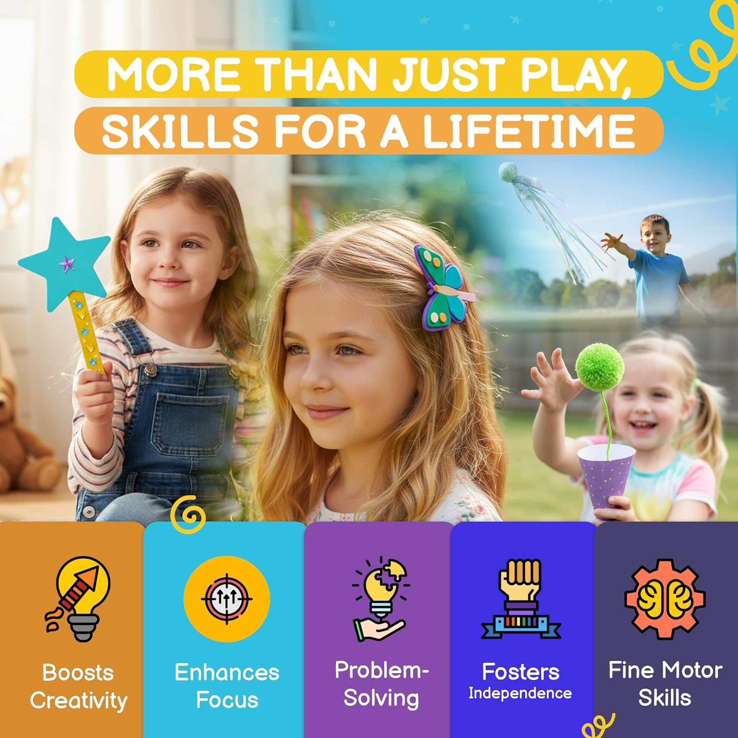 CRAFTS THAT BECOME TOYS – Fun That Lasts! – The fun doesn’t end when the glue dries! Each project transforms into a durable toy they’ll keep playing with. From a floating pirate ship and magic wand to a wearable mask and DIY flower bouquet, your child will take pride in playing with their own creations. It’s the perfect blend of a STEM building toy and a creative arts-and-crafts set.