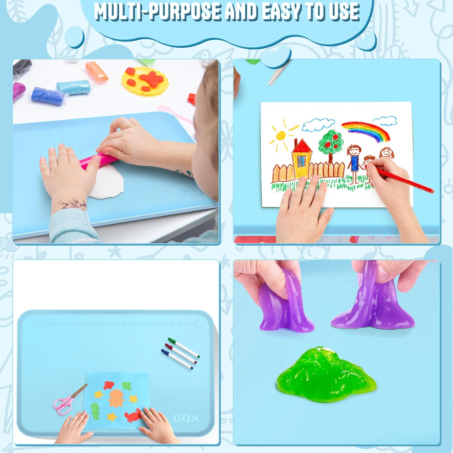 【Multi-Purpose & Easy To Use】The mat can serve as a painting mat, a DIY craft mat, a art mat for kids, placemats, a silicone game mat, a heat-resistant pad, and a pet feeding mat. It is suitable for various activities, including clay work, paper cutting, resin pouring, slime crafting, jewelry-making, and other crafts
