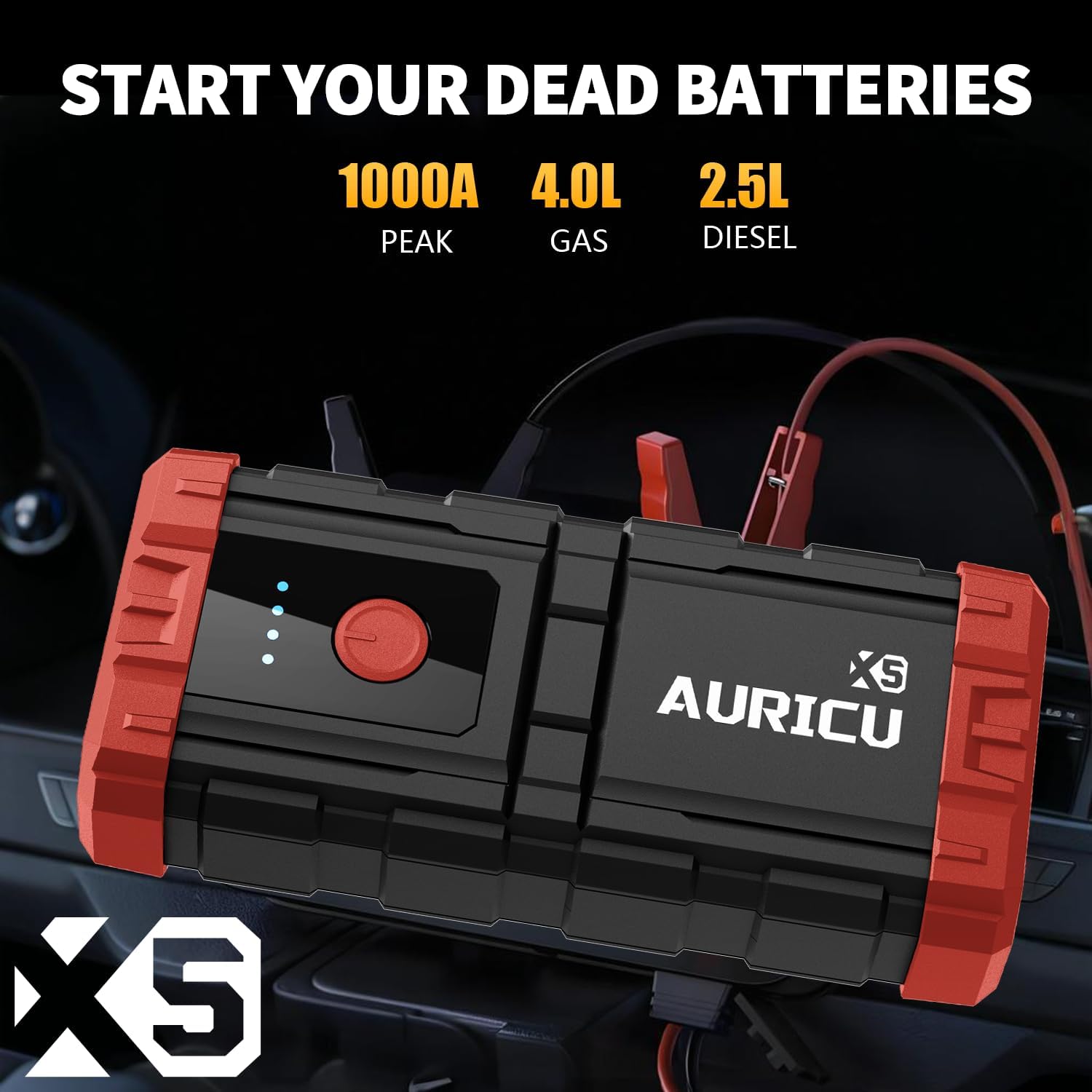 X5 1000A Jump Starter 12V Lithium Battery Booster Pack, Portable Jump Box, Power Bank & Jumper Cables for 4.0L Max Gas Engines