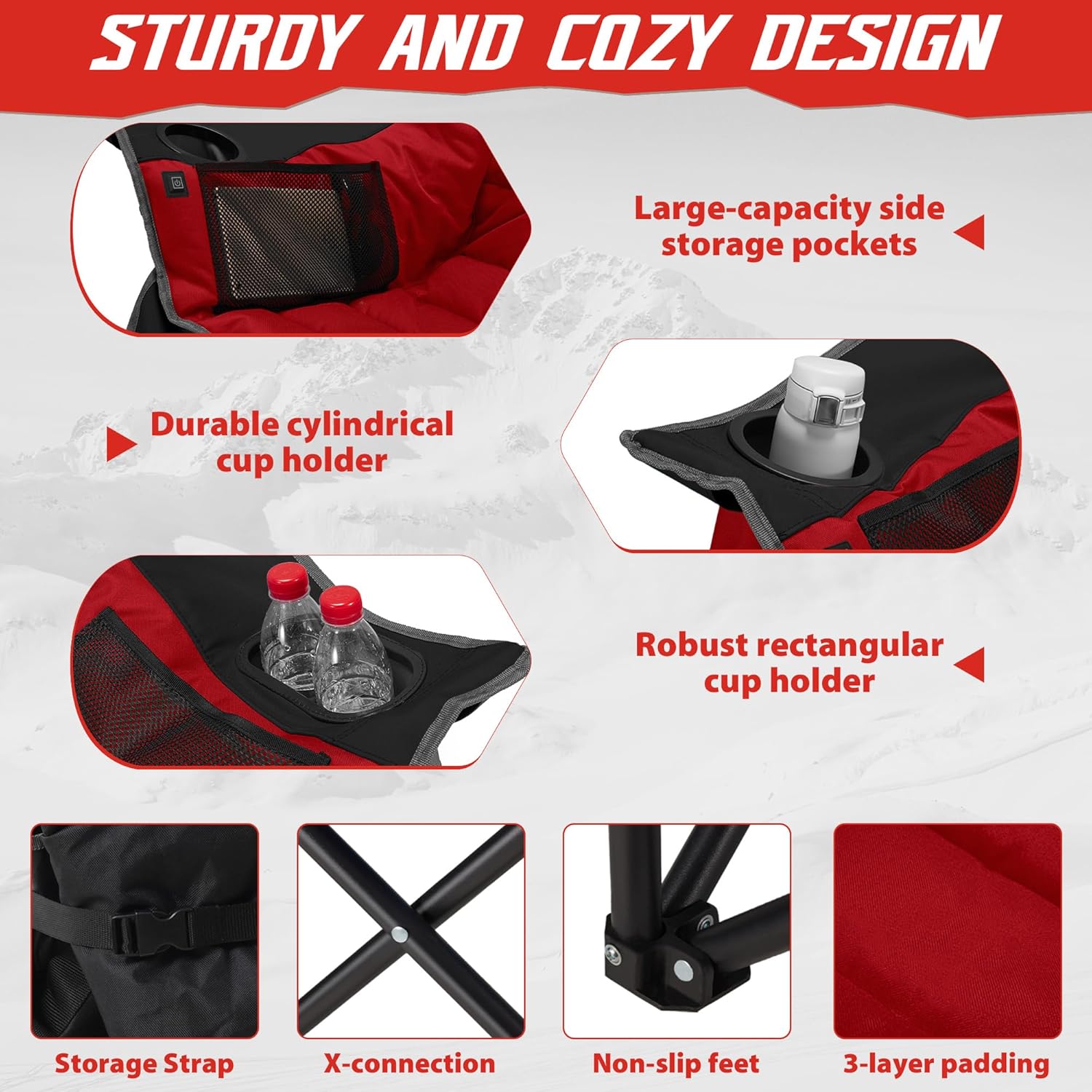 Specification: Youtanic Heated Camping Chair, 3 Heat Levels Oversized Padded Lawn Chair with Side Pockets and Cup Holder, Outdoor Heating Folding Camp Chair for Adults, Fishing, Sports, Picnic, up to 500lbs, Style 2